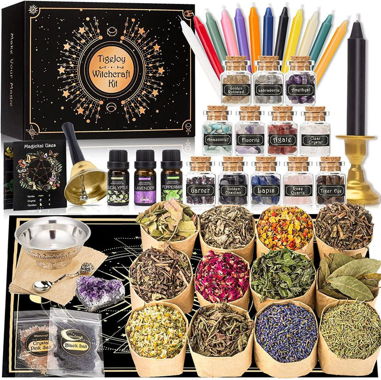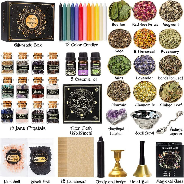-【GIFT-READY】 The complete Witch Starter Kit which is go inside a gorgeous boxes, it's an ideal gift for witchy, Wiccan, Pagan and other people which interested in witchcraft! Each product is individually packaged and labeled, ensure they easily accessible. And a unique designed magic booklet could help us understanding each supplies better. So it's also friendly beginner witch kit. TigeJoy Witchcraft BoxAn Ideal Kit for Interested, Beginner, and Experienced Witches/Wicca. Love and light