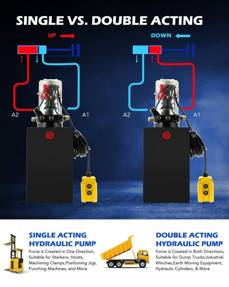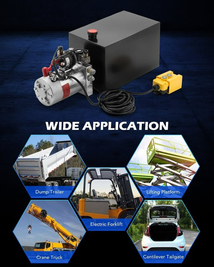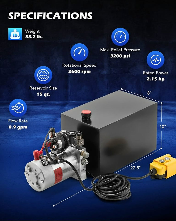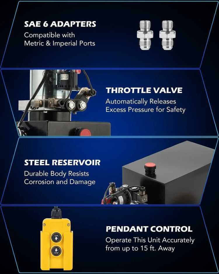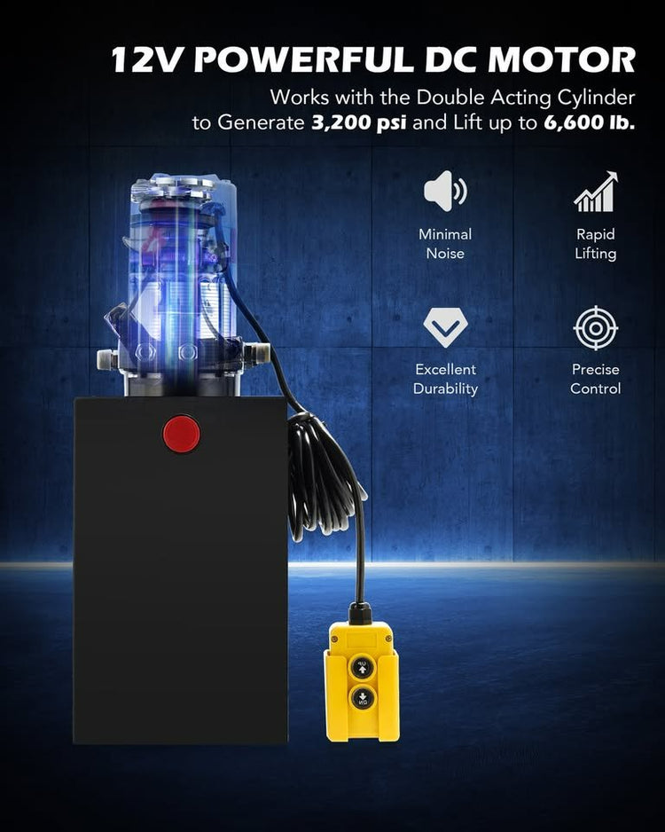 QUICK START & LOW NOISE: Our hydraulic pump starts fast, displacing 1.1 cc at 2850 rpm for a 0.83 gpm flow rate, quickly powering your tools and applications; the high-quality motor and pipes keep this machine to a low roar even as it's lifting your heaviest load SAFE OPERATION: The 15 foot pendant control lets you safely operate this power pump in a distance and the built-in safety valve overpressure unit protects your device against excessive pressure on the line during use