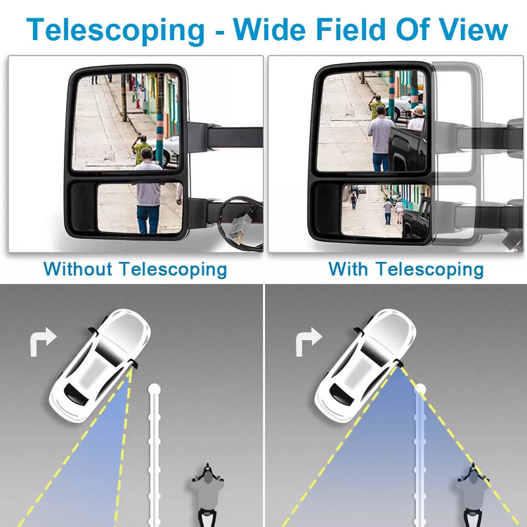 Features manual telescoping/extendable mirrors with wide-angle glass for enhanced visibility.