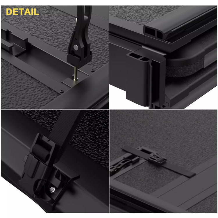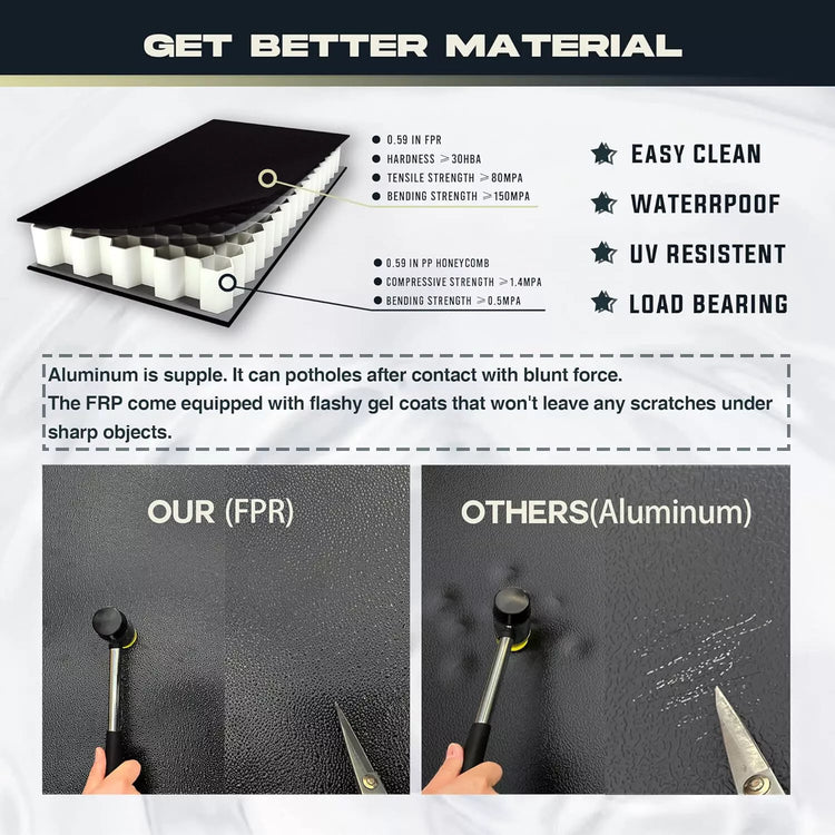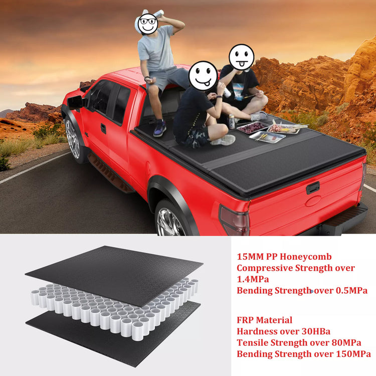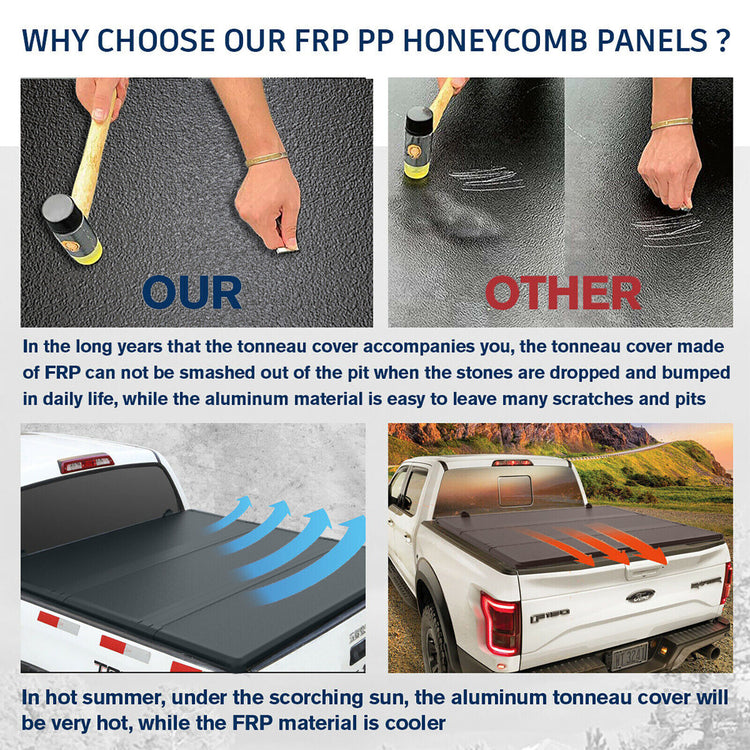 Durable Construction: Made from high-quality PP Honeycomb and FRP panels, this tonneau cover features a scratch-resistant, UV-protective black powder coat finish. The durable materials are designed to withstand up to 500 lbs of impact, offering excellent protection against theft and harsh conditions.