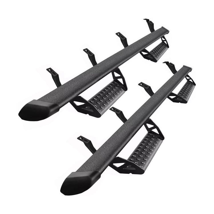 No drilling or modifications required. Includes a complete set of two running boards (driver and passenger side), custom mounting brackets, hardware, and step-by-step instructions for a straightforward bolt-on installation.