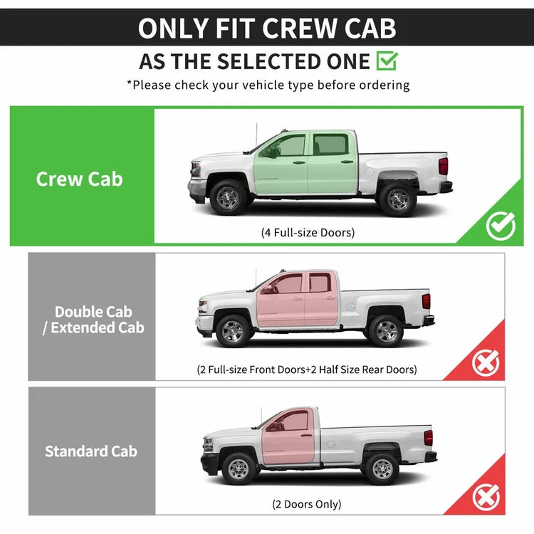 • 2007–2018 Chevy Silverado / GMC Sierra 1500Crew Cab models only