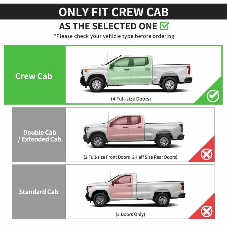 Fits: for 2019-2022 Chevrolet Silverado/GMC Sierra 1500 Crew Cab for 2020-2022 Chevrolet Silverado/GMC Sierra 2500/3500 HD Crew Cab (Incl. Diesel Models With DEF Tanks) (Excl. 2019 Silverado 1500 LD/2019 Sierra 1500 Limited Model)