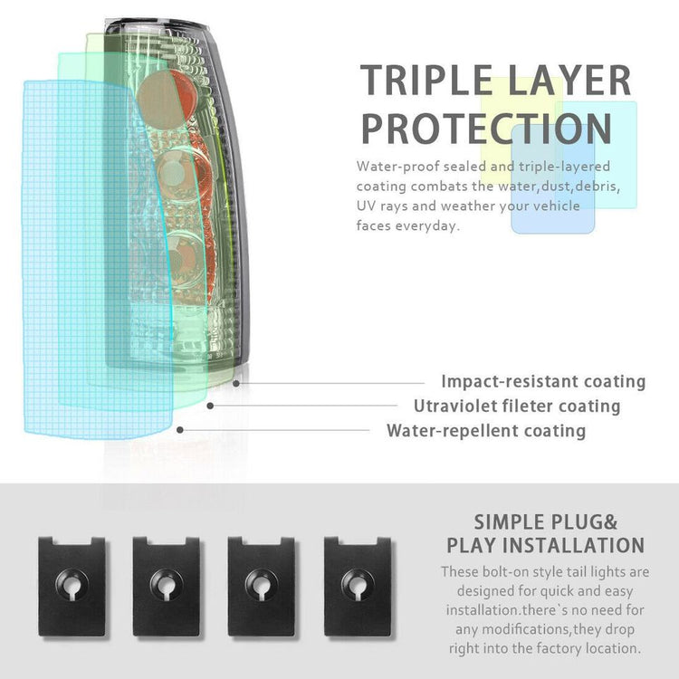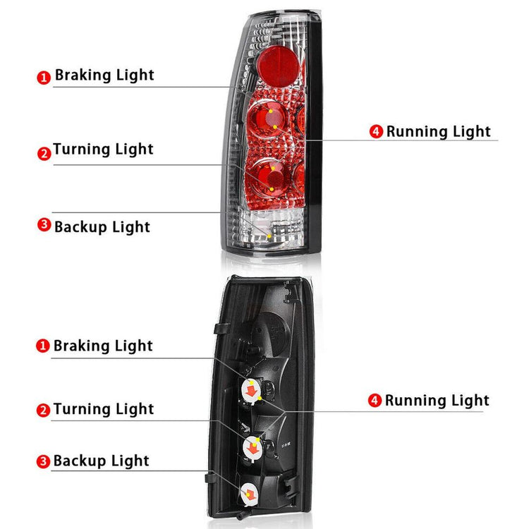 Fits for : for 1988-1998 Chevrolet C1500 C2500 C3500 K1500 K2500 K3500 Tail Lights for 1992-1999 Chevrolet Suburban Tail Lights for 1995-1999 Chevrolet Tahoe Tail LIghts for 1992-1994 Chevrolet Blazer Tail Lights for 1988-1999 Chevy/GMC C10 for 1996-1997 GMC C1500 C2500 C3500 K1500 K2500 K3500 Tail Lamps for 1992-1999 GMC Suburban Tail Lights for 1992-1999 GMC Yukon Tail Lights for 1999-2000 Cadillac Escalade Tail Lights OEM Left # 5977867 OEM Right # 5977868 Partslink Left # GM2800104 Partslink Right # GM2801104