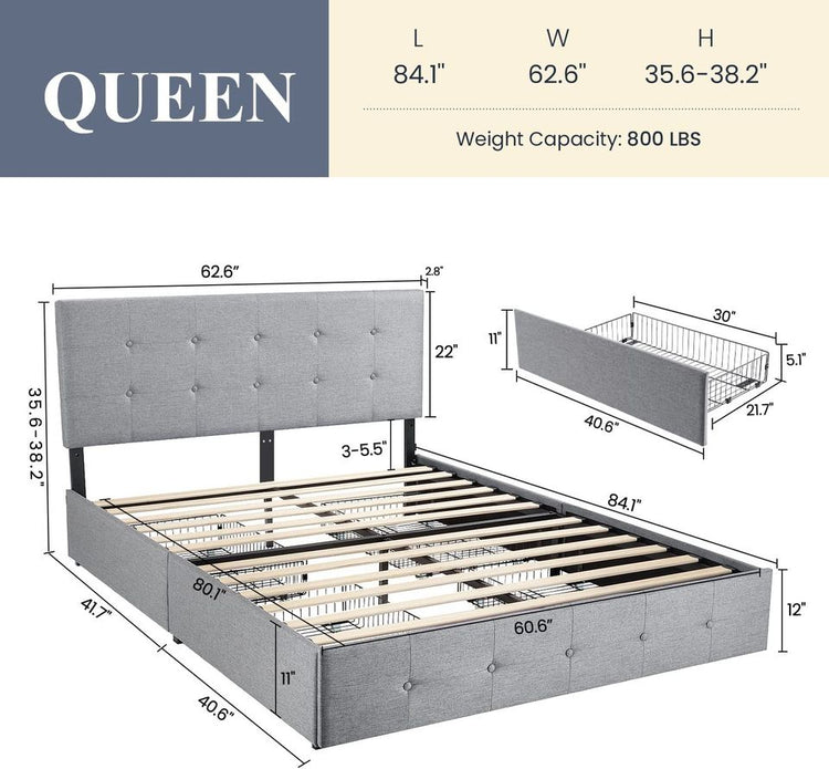 💥Sale💥Queen Size Platform Bed Frame with 4 Storage Drawers & Adjustable Headboard, Upholstered