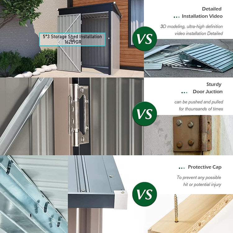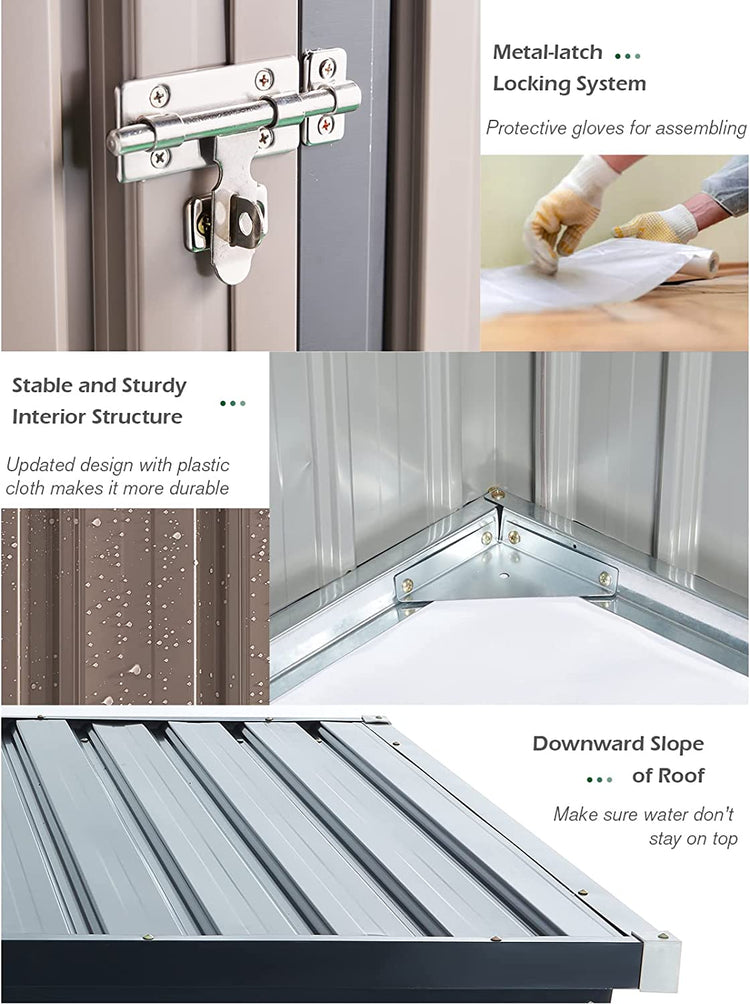After long-period research and survey, we rigorously designed the sloping roof for all three sizes of sheds, to avoid water reserve under heavy rainy days. Special design of air vents to prevent any lack of air inside, plastic caps to avoid injury while people's around. Sturdy and reinforced interior structure to make the shed withstand as long-lasting.