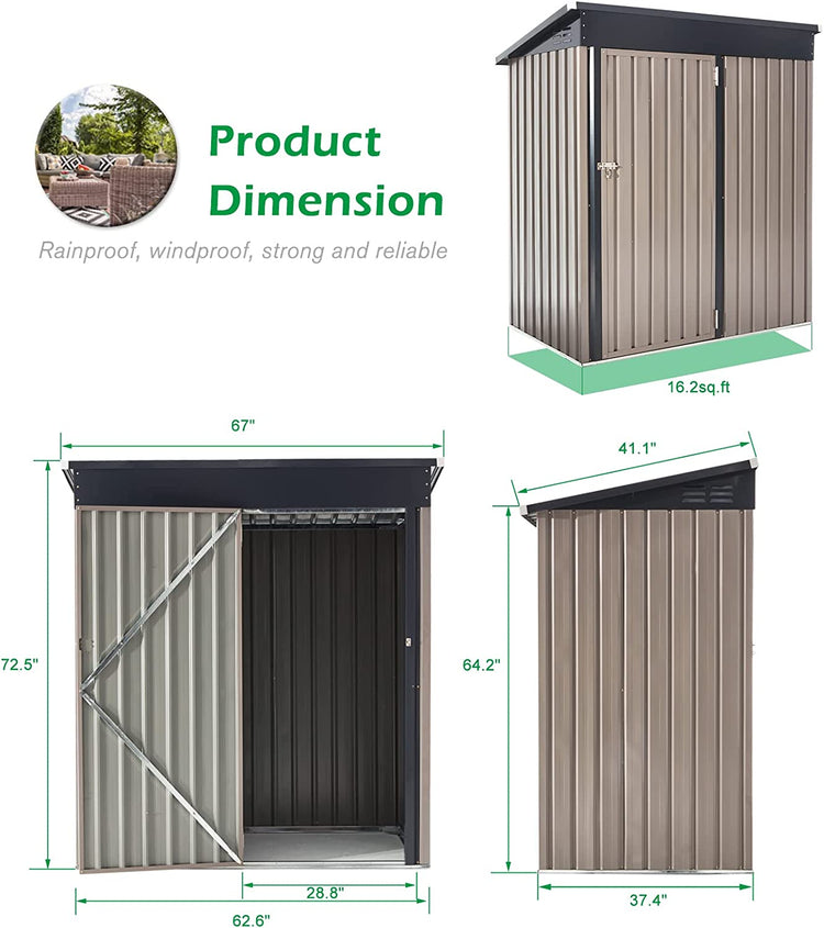 Spacious Outdoor shed: 72.5" x 62.6" x 37.4" for 5' x 3' tool shed, with door size of 62.6" x 28.8", as enough height for a adult to enter through.