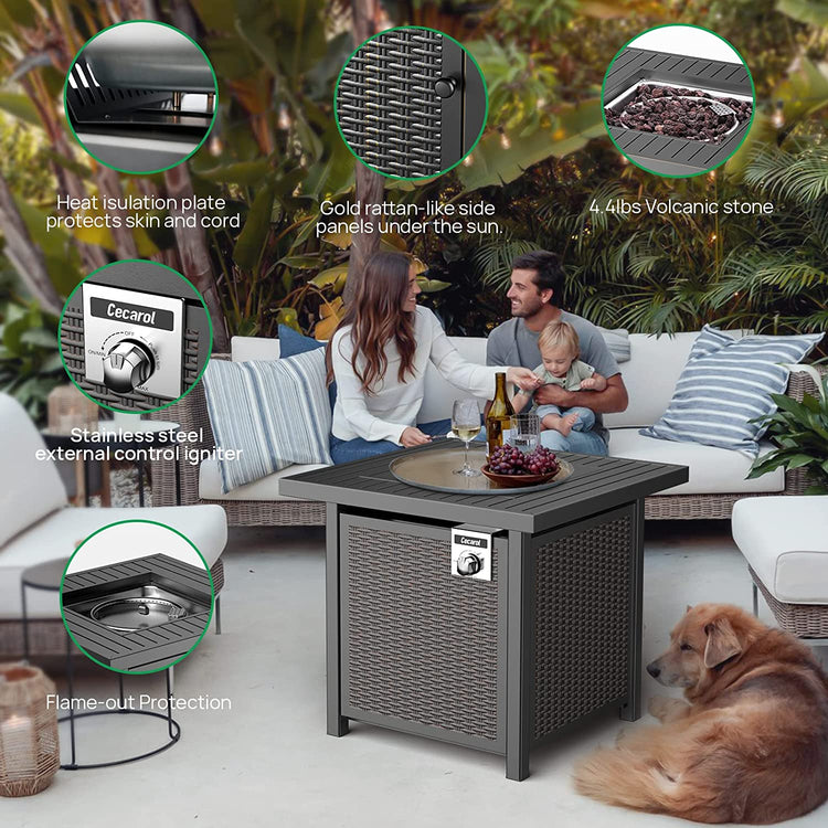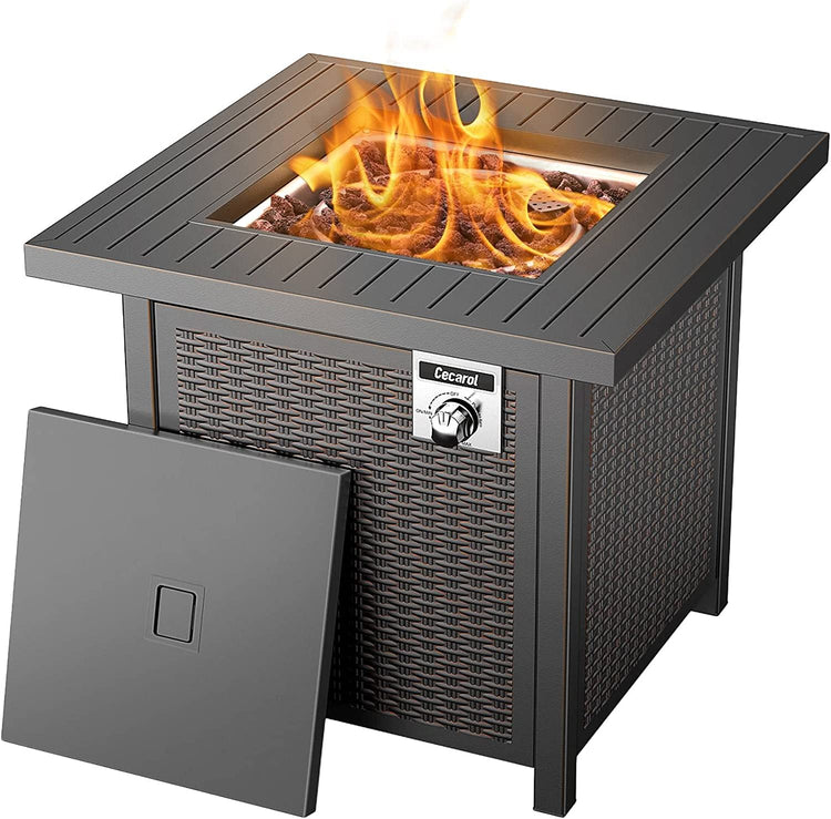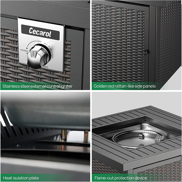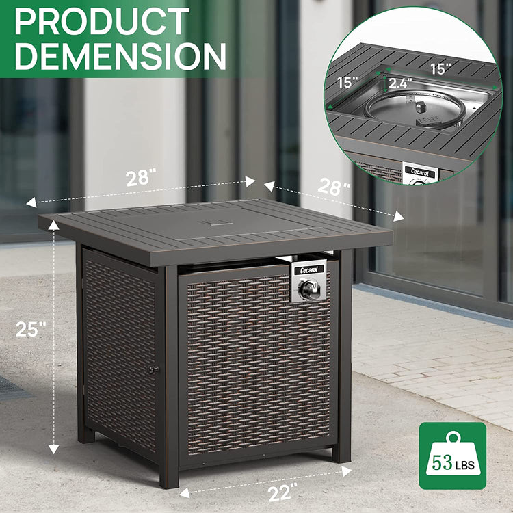 Material Metal Product Dimensions 28"D x 28"W x 25"H Style Classic-Fence Tabletop Brand Cecarol Finish Type Painted Shape Square Item Weight 53 Pounds Fuel Type Liquefied Petroleum Gas Assembly Required Yes - Party Center——Do you need an extra side table while enjoying the flames? This 28" square table has enough rim for food and drinks. Your friends will be satisfied with such a place for food and drinks at a party, a nice place to chat.