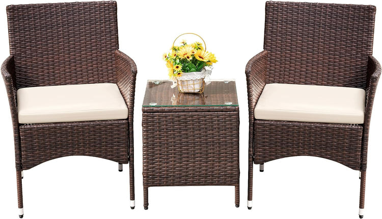 Patio Porch Furniture Sets 3 Pieces PE Rattan Wicker Chairs with Table Brown/Beige