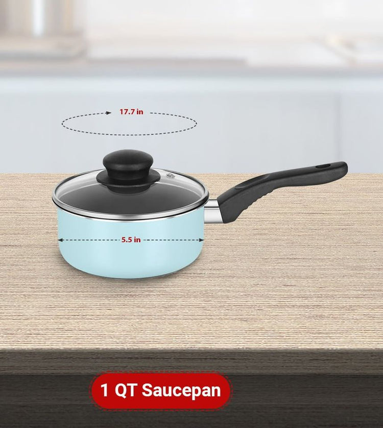 7 Piece Non-Stick Cookware Set includes 1 Qt. Saucepan with Lid, 2 Qt. Saucepan with Lid, 4 Qt. Dutch Oven with Lid and 8 inch. Frying Pan.