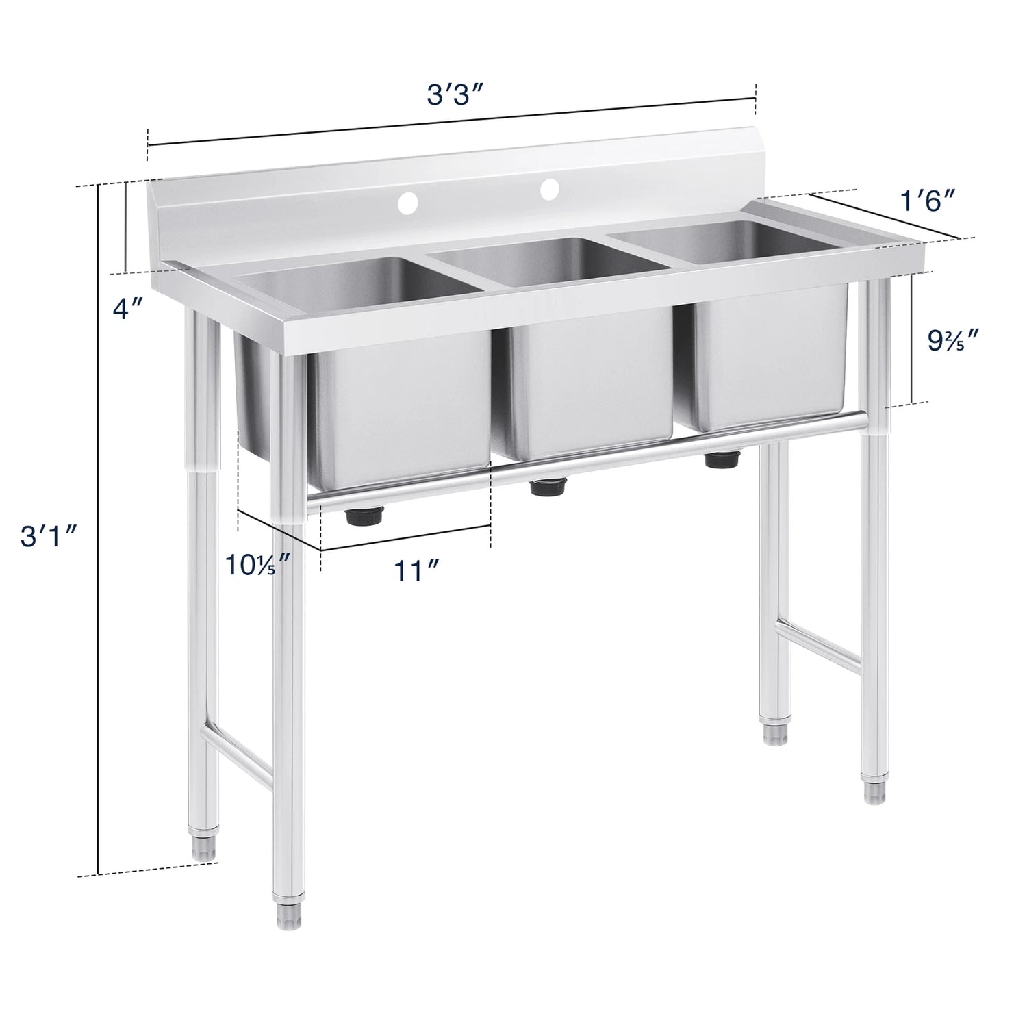 Freestanding Kitchen Sink Commercial Utility Stainless Steel Sink 3 Compartment