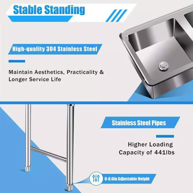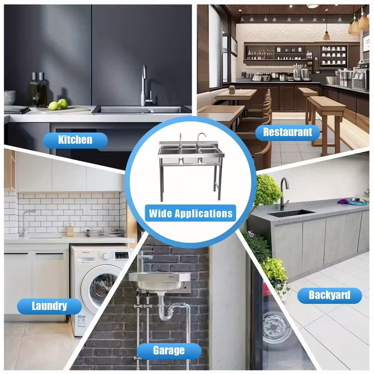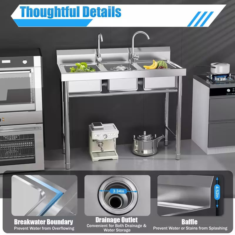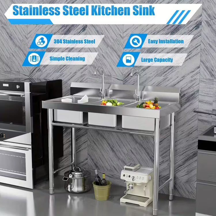 Heavy-Duty Commercial 3-Compartment Sink - Heavy-Duty 304 Stainless Steel Kitchen, Laundry, Restaurant Sink with Individual Drain Basins