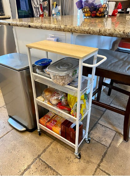 Slim Storage Cart 4 Tier Rolling Kitchen Shelving Unit on Wheels Mobile Narrow Cart with Wooden Tabletop