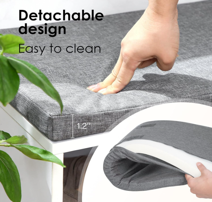 The shoe bench top cushion is 1.2 inches thick and features high-density foam filling covered with fine linen. It provides a comfortable seating experience, even in winter when it feels cold. The cushion is secured in place with Velcro, allowing for easy disassembly and cleaning or replacement.