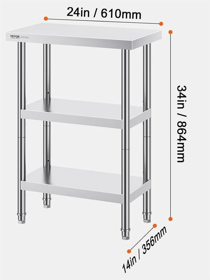 High-Quality Stainless Steel: This work table, measuring 14 x 24 x 34 inch. Large Storage Capacity: The 3-tier design offers ample storage space, allowing you to make the most of your storage needs. With adjustable shelves, you can easily raise or lower the height by adjusting the screws to fit the size of the items you need to store.