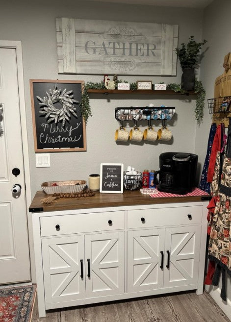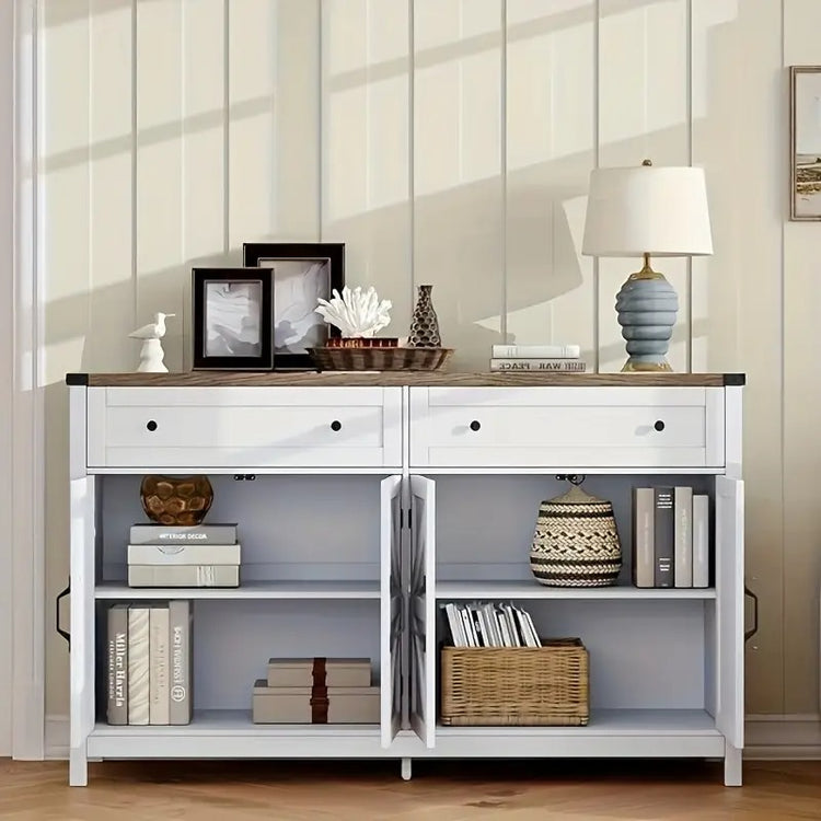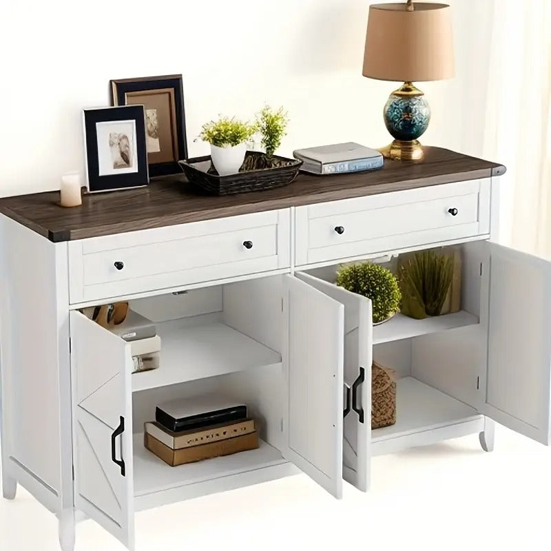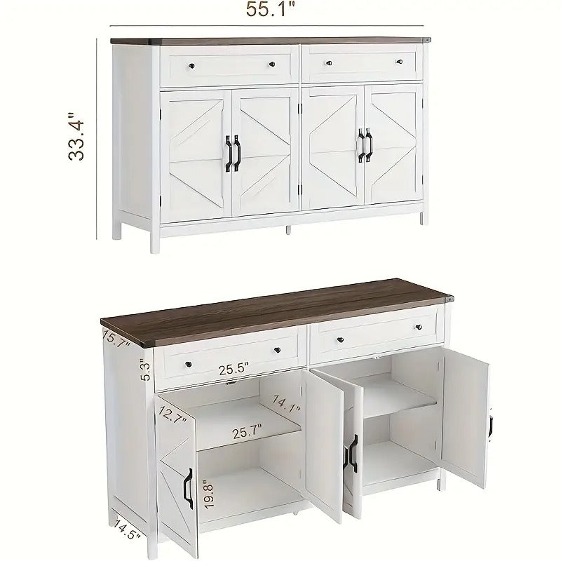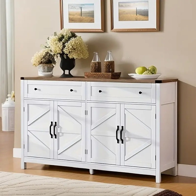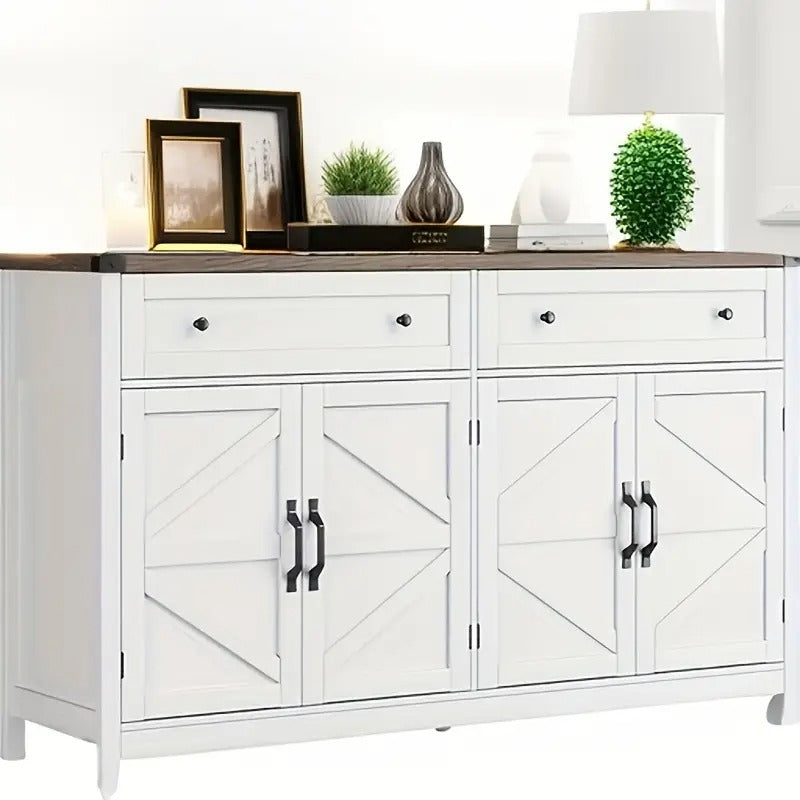 Designed to meet your everyday storage needs, this white buffet cabinet offers a spacious tabletop perfect for coffee makers, microwaves, or decor. Two smooth-gliding drawers keep utensils, napkins, and paper towels organized, while four barn-style cabinets with adjustable shelves provide flexible storage for mugs, dishes, and other kitchen essentials.