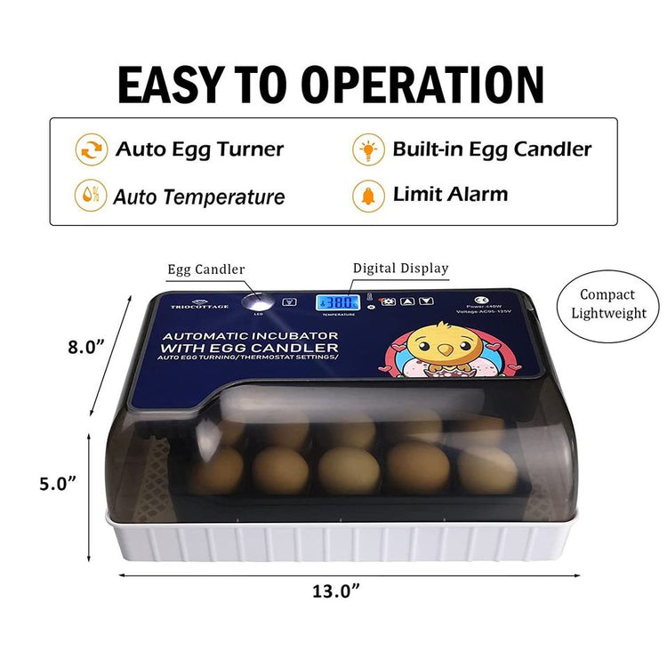 AUTOMATIC INCUBATION,SIMPLE OPERATION : This Triocottage chick incubator automatically rotate the eggs every two hours as if the mother hen is turning the egg.Optional digital automatic tempe control,simple humidity adjustment. It eases the incubation process helps higher hatch rate.