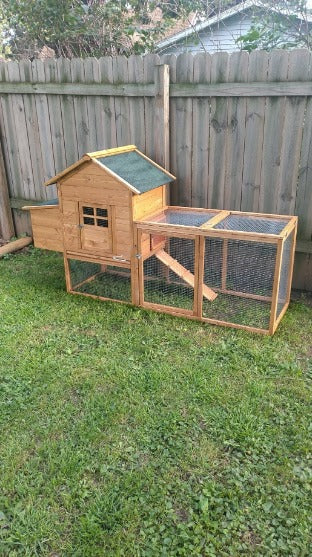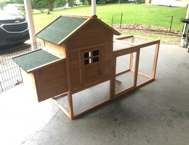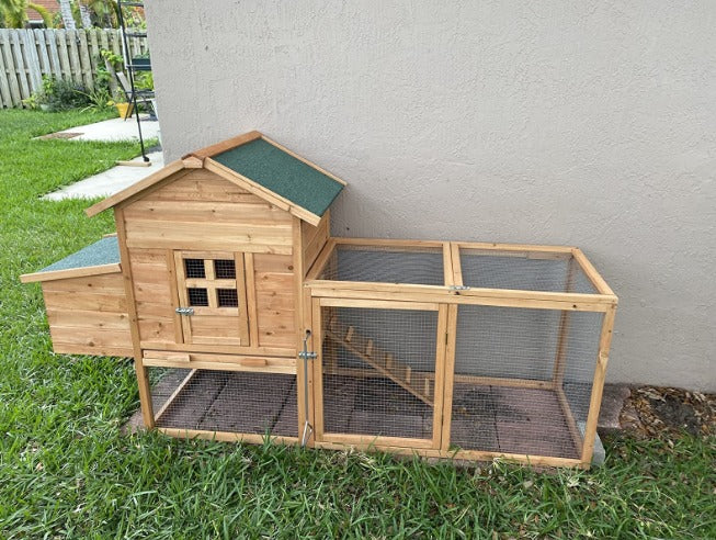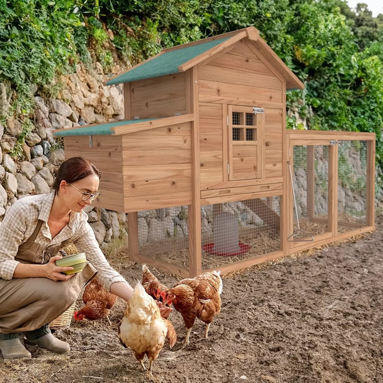 Crafted from solid, rain-resistant fir wood and coated with environmentally friendly paint, this poultry hutch is designed to be waterproof and sun-resistant, ensuring lasting durability in all weather conditions. The green asphalt sloped roof further enhances protection by preventing water penetration.