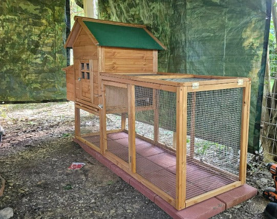 The elevated design of the main house helps guard against moisture and ground-level pests. It connects to a spacious fenced run, giving your chickens plenty of room to roam and explore. Ideal for housing 2–4 chickens.
