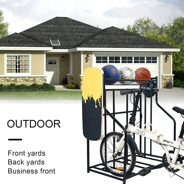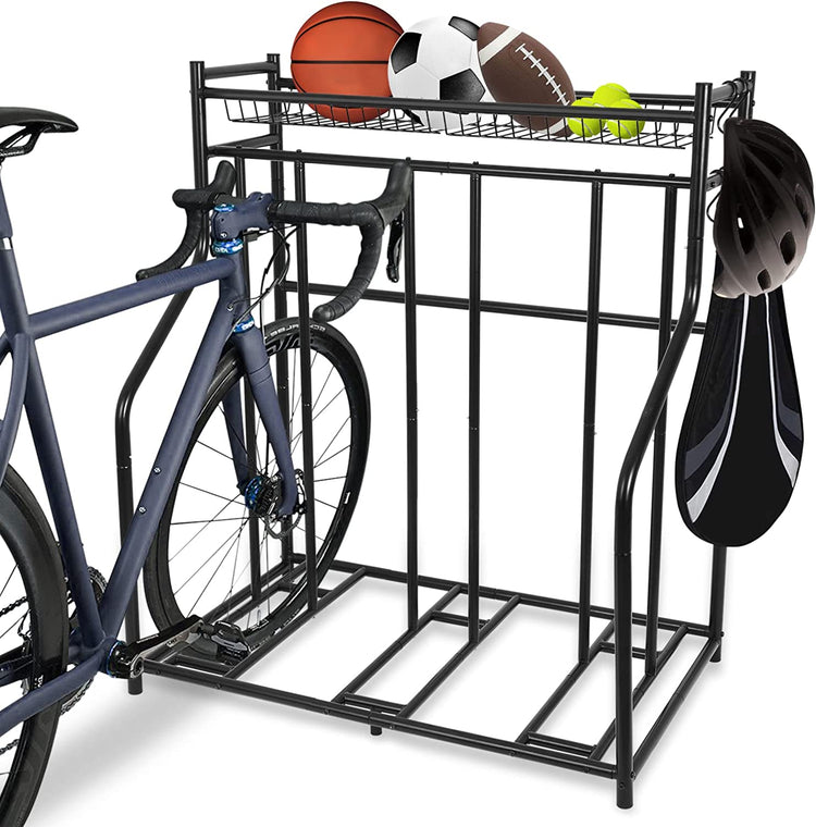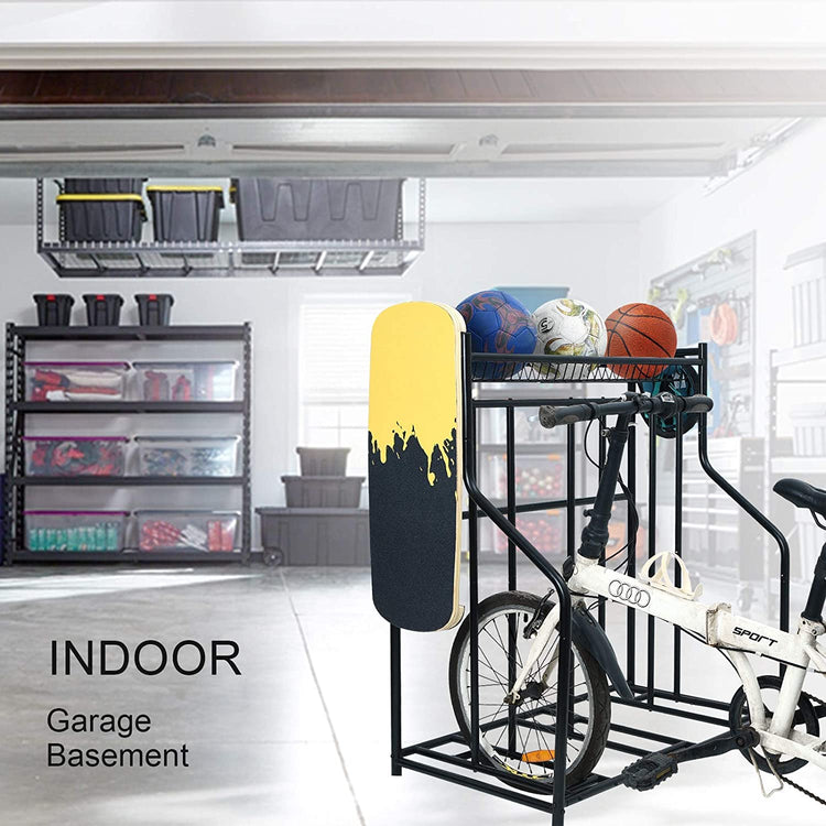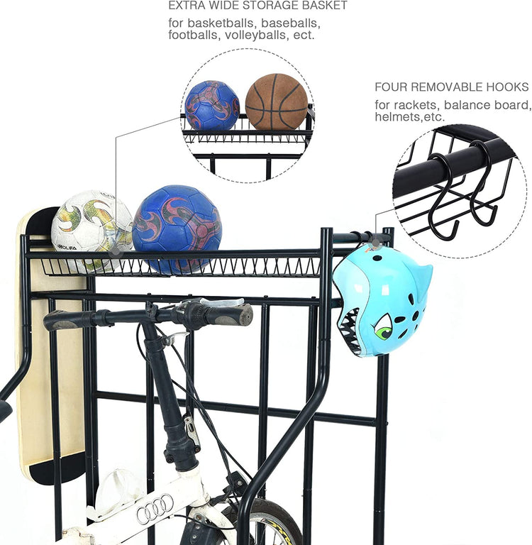 - ✔Multifunctional Design: This bike storage can keep all your sport equipment in order. It is capable of holding up to 3 bicycles. The top shelf basket is an ideal destination for your footballs, baseballs, basketballs, gloves, etc. The four side hooks are perfect for the tennis rackets,balance board, skateboard, etc.