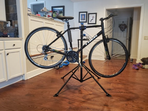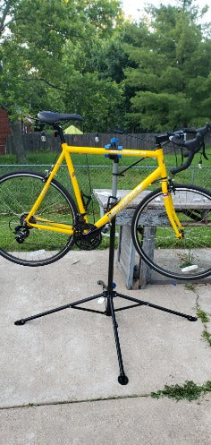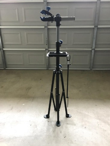 Bicycle Repair Stand's Features: - Clamps rotate 360 degrees for easy access to every part of your bike - Adjustable handlebar rod stabilizes the front wheel - Telescoping stand adjusts from 42-74 inch - Work Horse clamps fit nearly all standard frames from 1" to 1.8" - Easy to assemble and foldable legs for space saving - Heavy Duty Construction with 4 stable folding legs for extra stability - Built with a tool tray,the tools you need can be organized in order