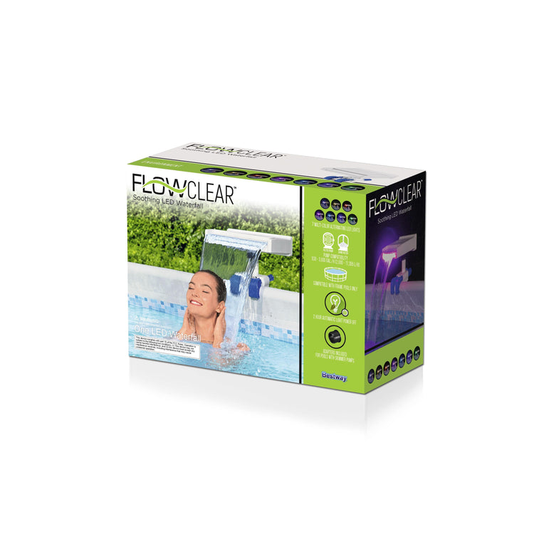 Size: 13 in. x 9 in. x 12 in. (34 cm x 24 cm x 32 cm) Serene waterfall maintains continuous flow 8 modes - 7 single colors and 1 color-alternating Light will automatically power off after 2 hours Light is powered by 3x AA batteries (batteries not included) Quick and easy installation Compatible with filtration systems with 530-3,000 gal./h (2,006-11,355 L/h) flow rates Includes one adapter to connect to both 1.25 in. (32 mm) and 1.5 in. (38 mm) hoses Contents: 1 waterfall, 1 hose adapter