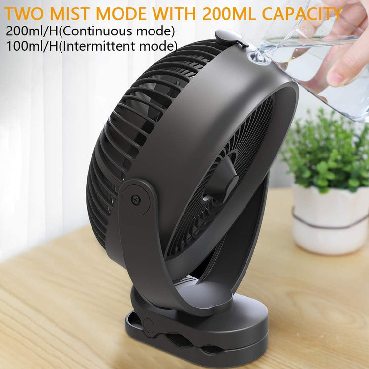 🧿【Unique Misting Function】This clip misting fan comes with 2 mist modes: continuous mode and Intermittent mode. With a 200ml tank, the desk fan can work 1-2 hours on different modes.