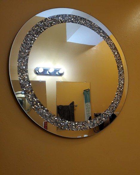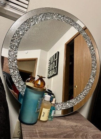 Dimensions 12"L x 12"W Frame Material Glass, Engineered Wood, Iron 🧿Material: sparkling crushed diamond, high quality silver glass mirror, strong thick wood back, iron chain together to make this beautiful mirror. The mirror is constructed by MDF wood back for reinforcement and stability. And it come with a white hanger for wall hang use.