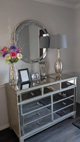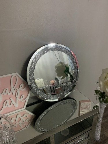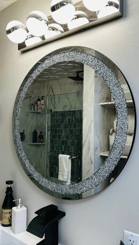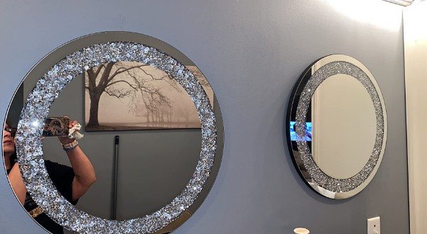 🧿Material: sparkling crushed diamond, high quality silver glass mirror, strong thick wood back, iron chain together to make this beautiful mirror. The mirror is constructed by MDF wood back for reinforcement and stability. And it come with a white hanger for wall hang use.