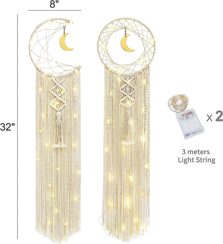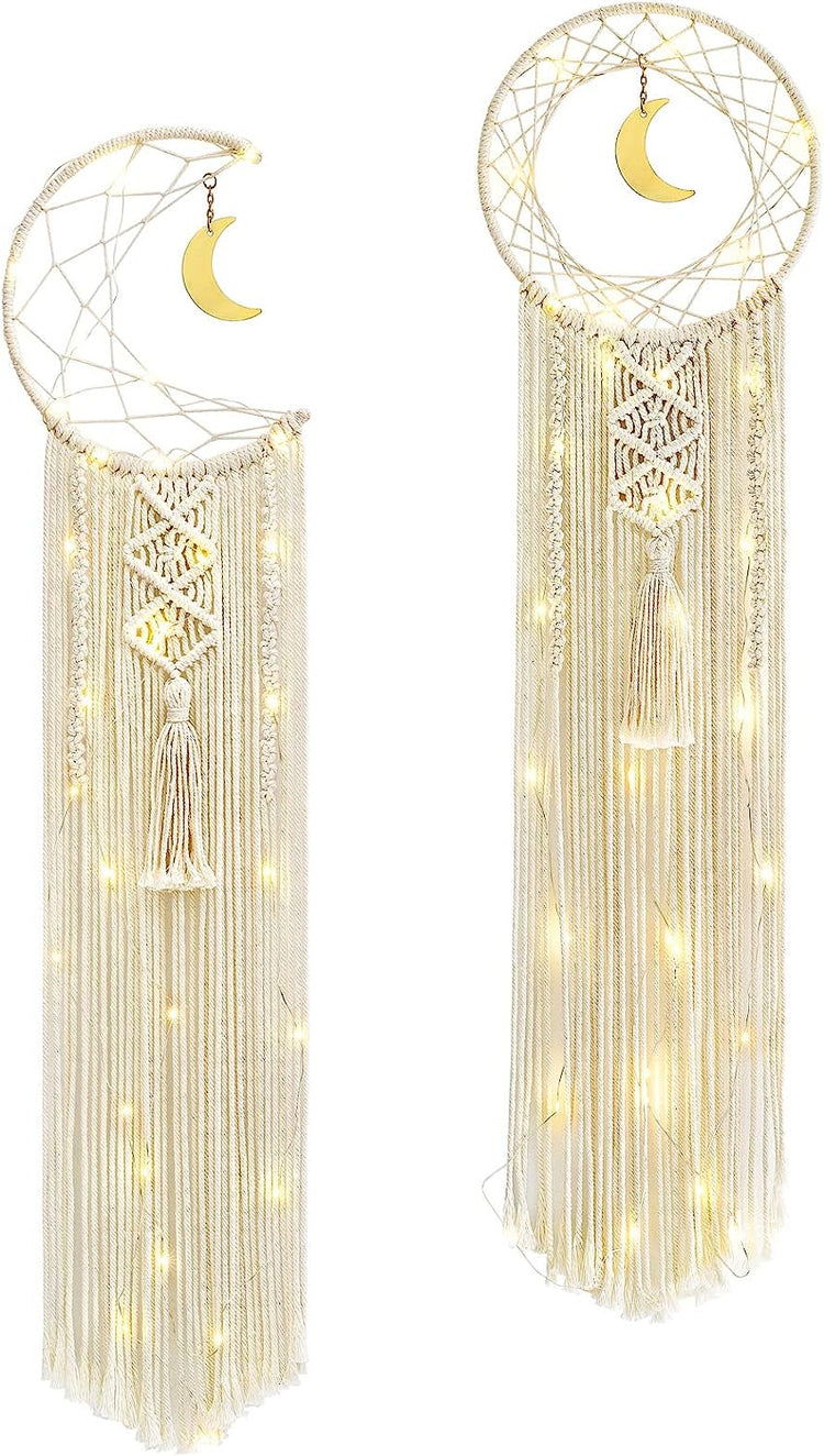 2 Pack Macrame Dream Catcher with String Lights, Boho Handmade Circle Moon Dream Catcher Decor