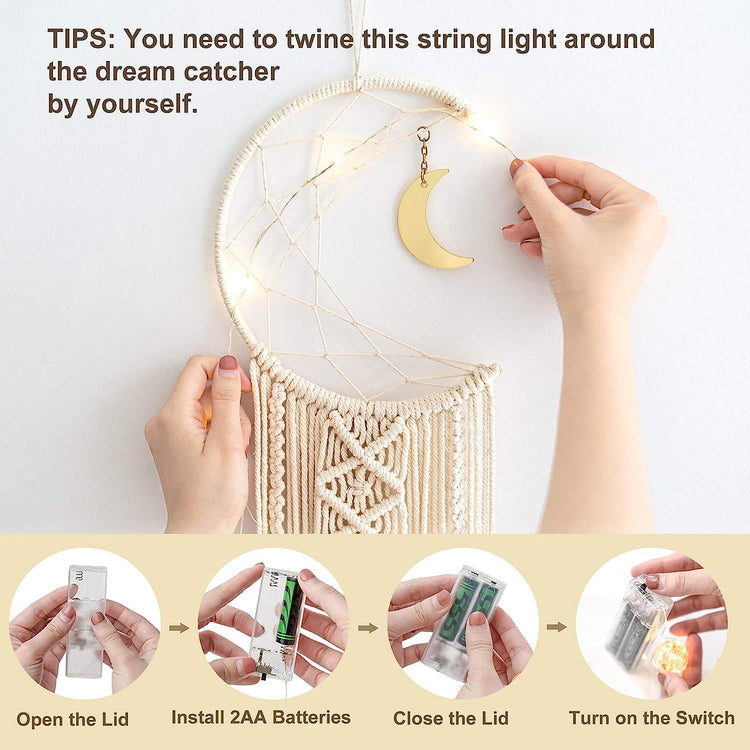 Gift Idea: With this dream catcher set that instantly add a bohemian vibe to any room and warm up a space. Perfect gift choice for family, lover, children and friends. Package and Size: Package: 2 pcs dream catchers and 2 pcs string lights.