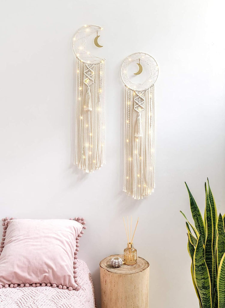 The led light together with the macrame dream catcher is a great decoration for your room. Cute Moon Net Design: