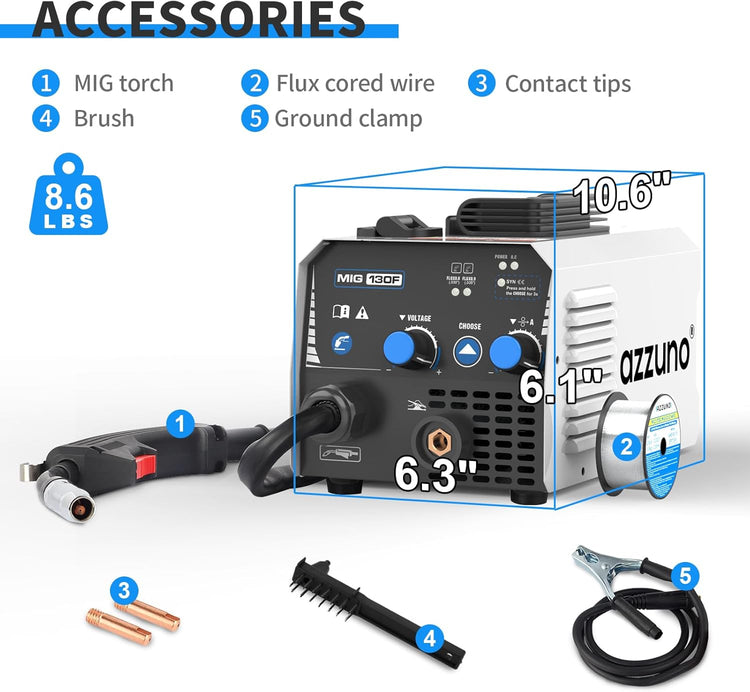 PACKAGE INCLUDES: 130 MIG welding machine, MIG torch, ground clamp, brush & hammer, 1 lb of .030" flux-cored welding wire, and 2 contact tips.