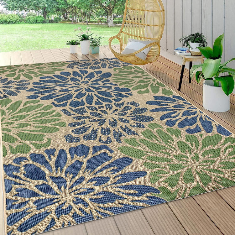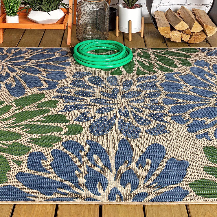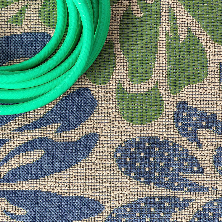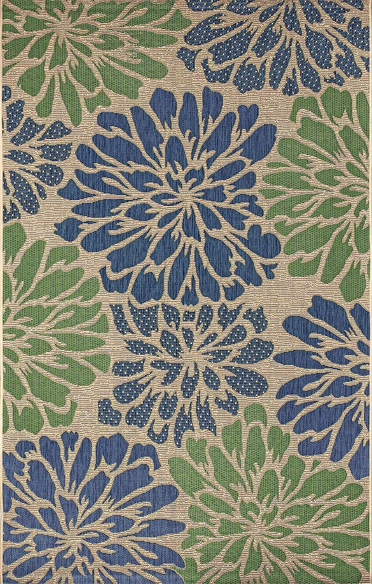 -EASY TO CARE FOR: Vacuum and sweep regularly to prevent grit from breaking down fibers; To wash an outdoor rug, spray the surface with a 5-1 mixture of mild dish soap and water then rise with a garden hose and hang over a railing to dry thoroughly; -Flat-weave Construction of 100% polypropylene -Leafy green and navy flowers on a beige ground Add some graphic punch to your porch or patio with the bold blooms on our modern floral rug. The large-scale pattern has a geometric effect in a simple palette of leafy green, deep blue and beige. The flatweave design is great for high-traffic spaces indoors too.