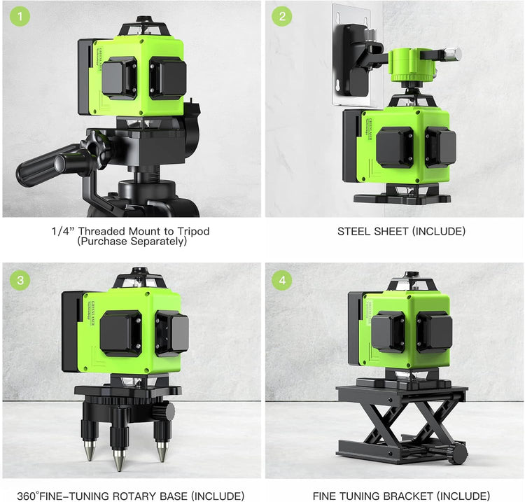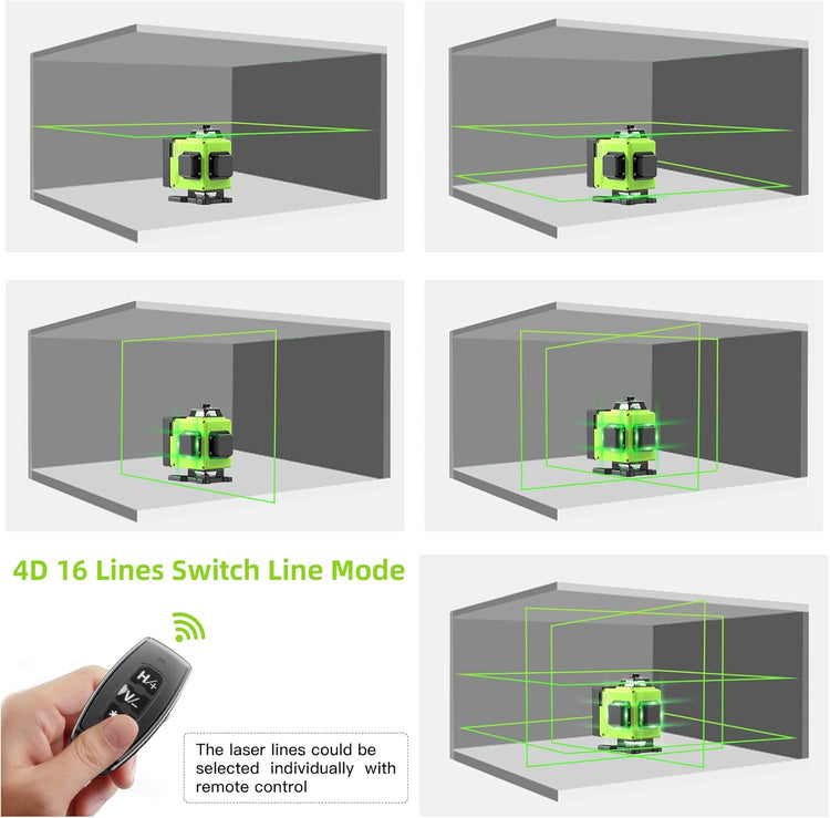 What’s Included: 1x 4D 16-Line Laser Level, 1x Carry Bag, 1x Power Charger, 1x 1/4” Tread Mount, 1x 5/8-20" Tread Mount, 1x Wall Iron, 1x User Manual, 1x Remote Control, 1x Green Target Plate, 1x Wall Bracket, 1x Lifting Platform, 2x 4000mAh Batteries.