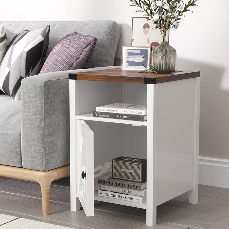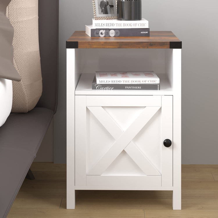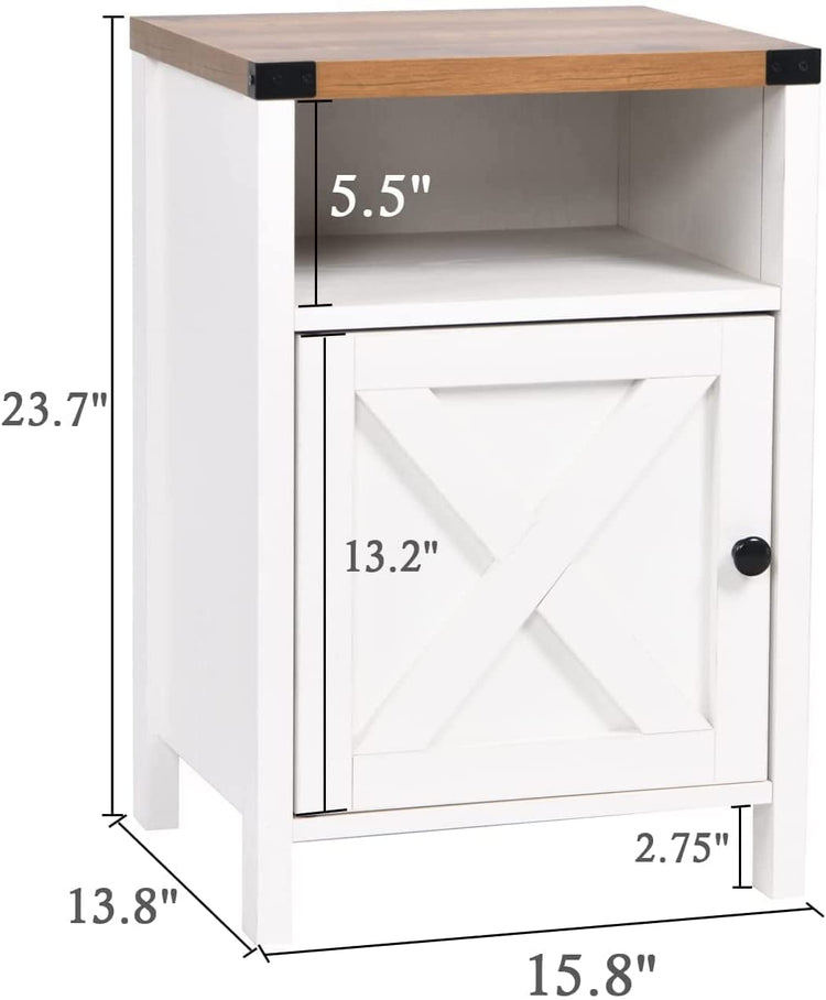 - 【Ample Storage Space Side Table】: The rustic bedside table includes an open shelf to store your journals, cosmetics, toys, underwear, socks and keys. The night stand cabinet with a wooden barn door of the side table as a bookcase to keep the books well organized. The wood top of the nightstand provides a durable surface for displaying alarm clocks, cups, glasses and magazines and more. The farmhouse nightstand with ample storage space meets your daily needs about storage.