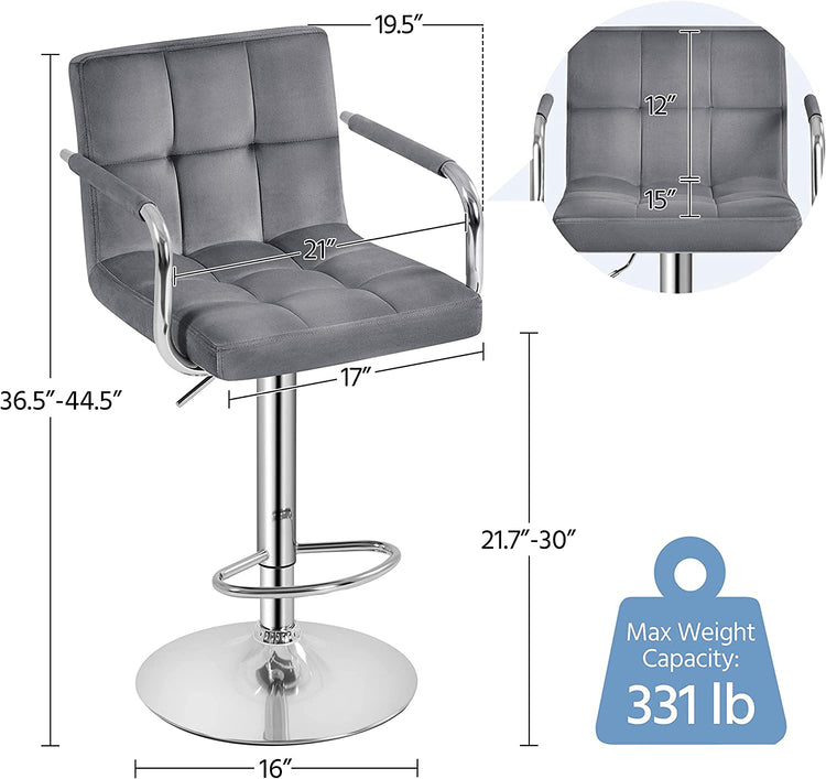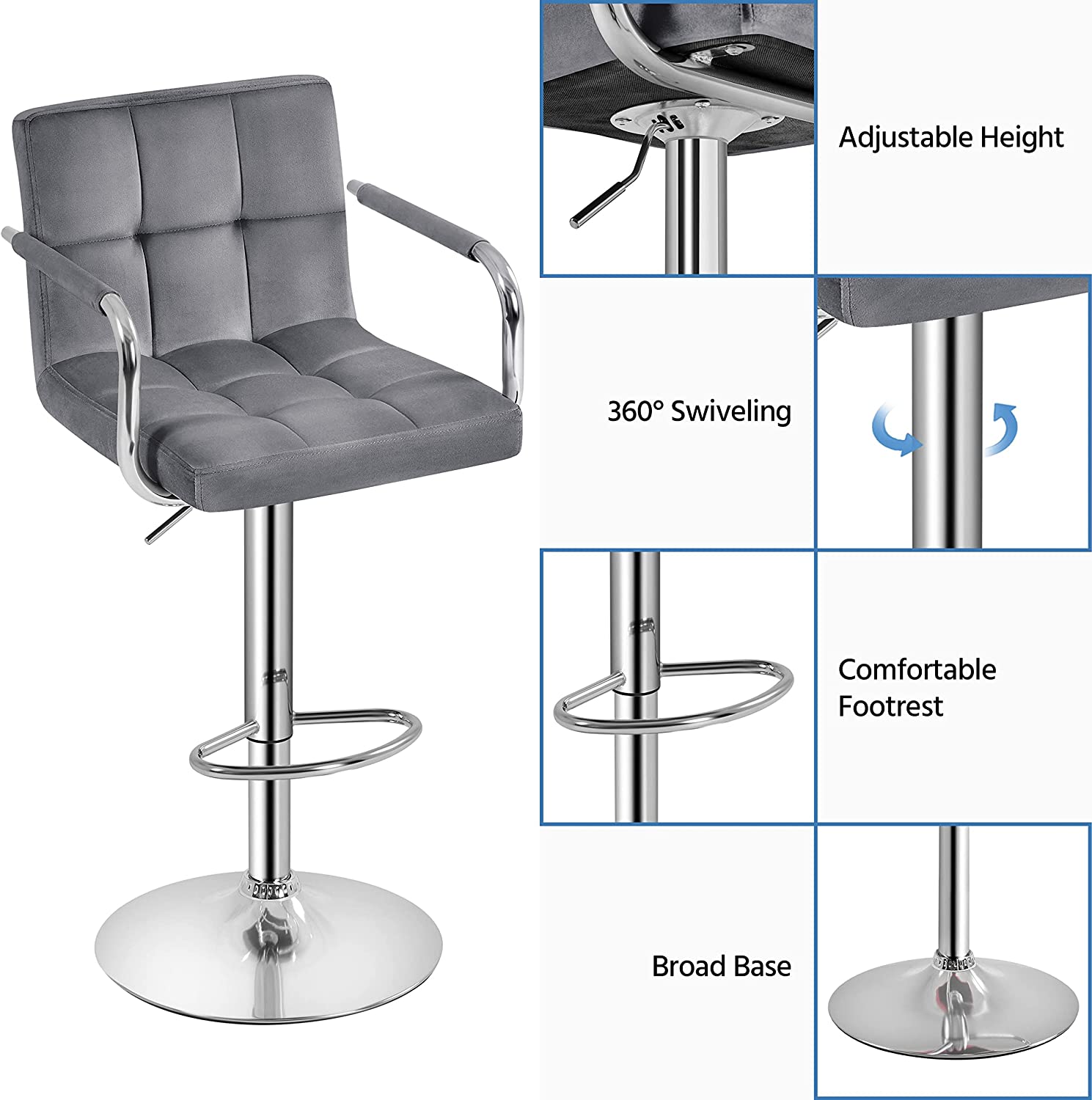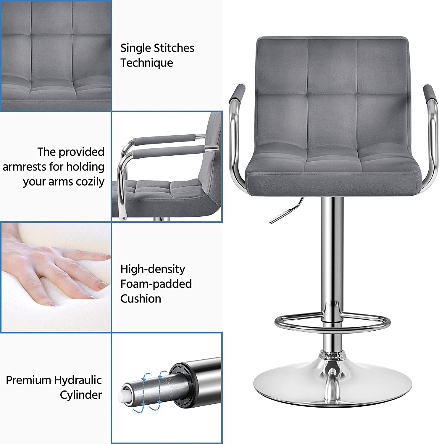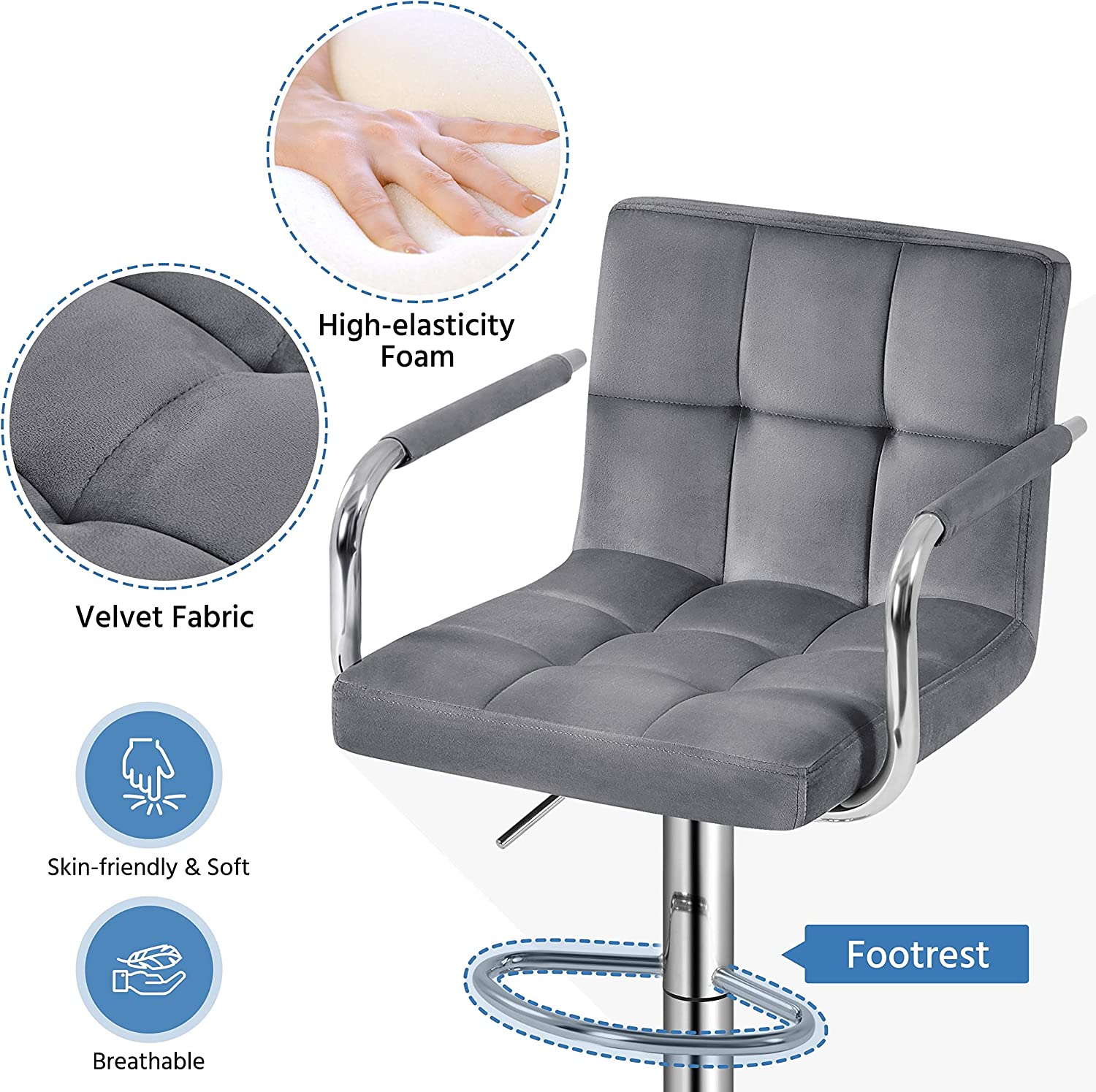 2 Set Counter Height Bar Stools Height Adjustable with Armrest, Velvet Grey/Black