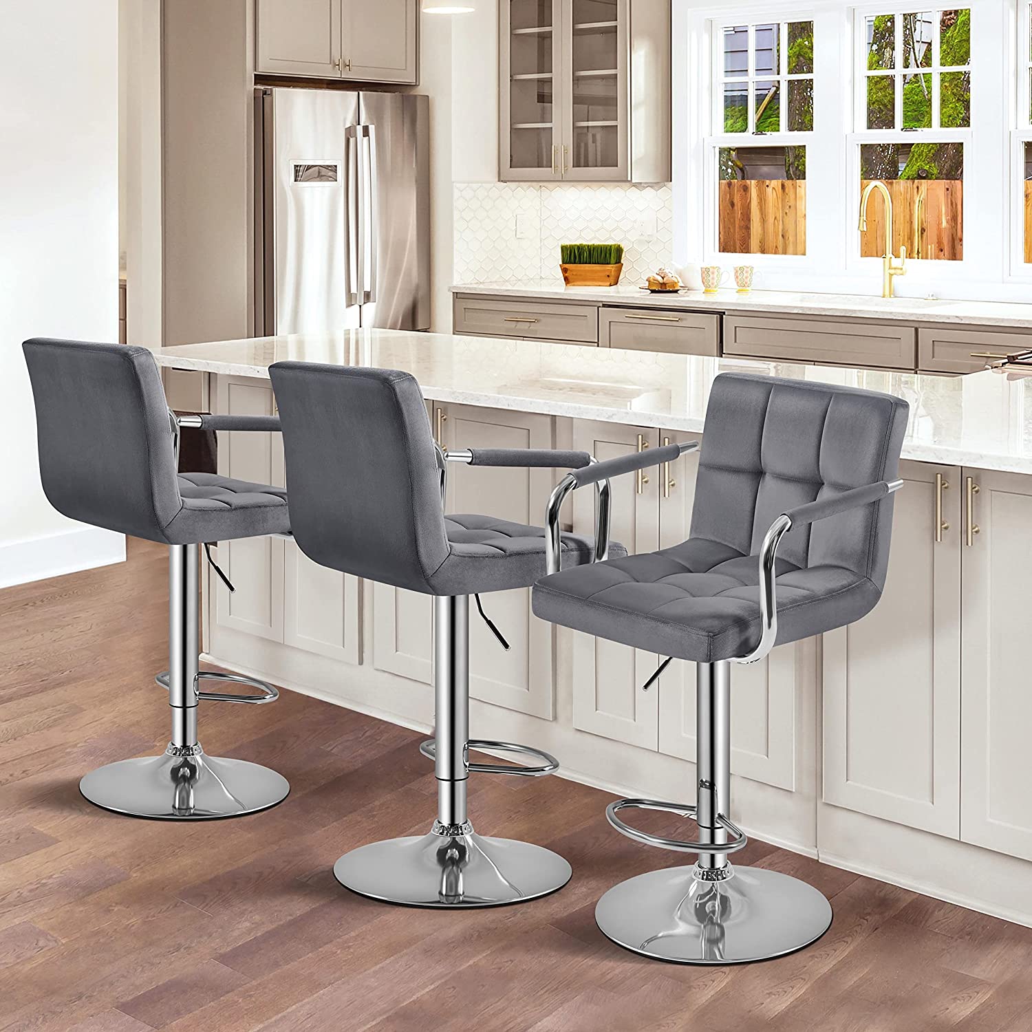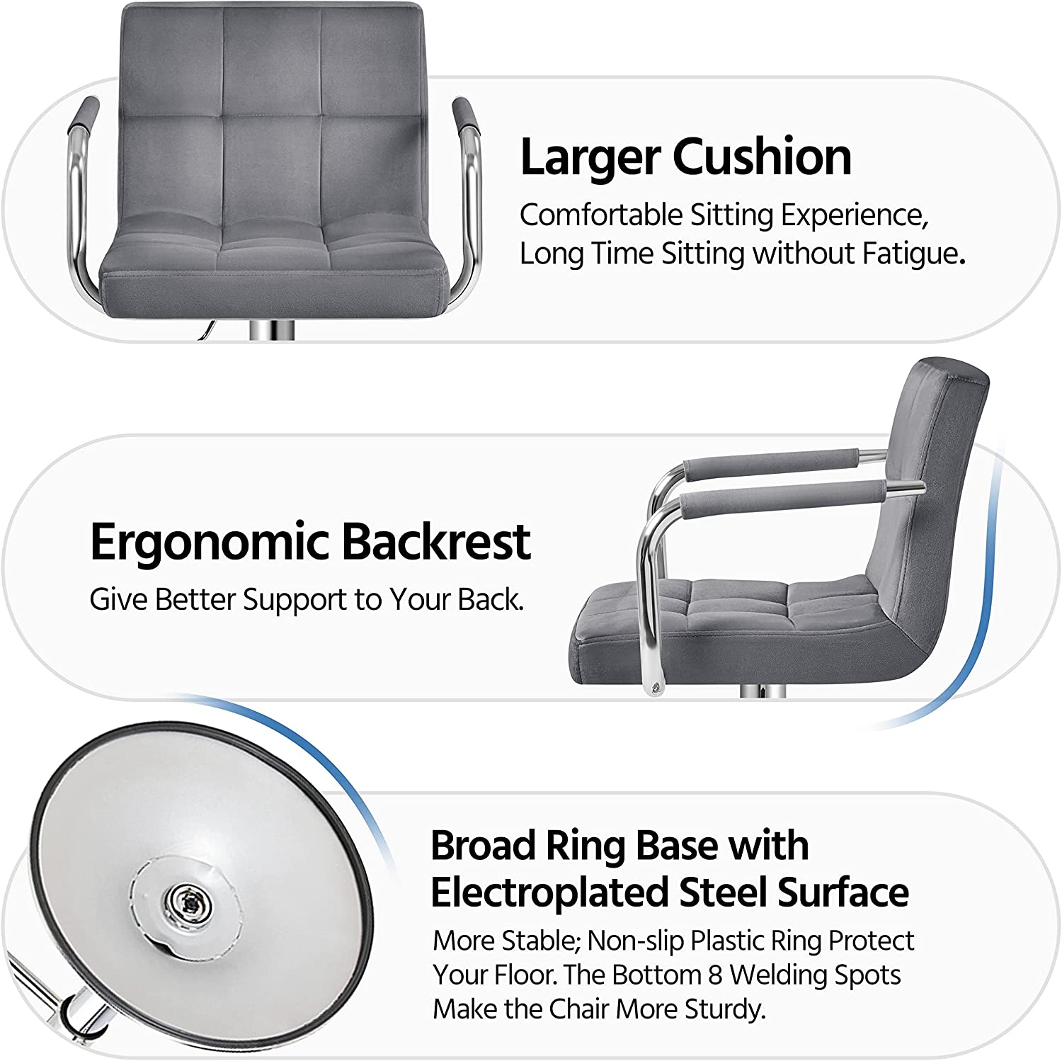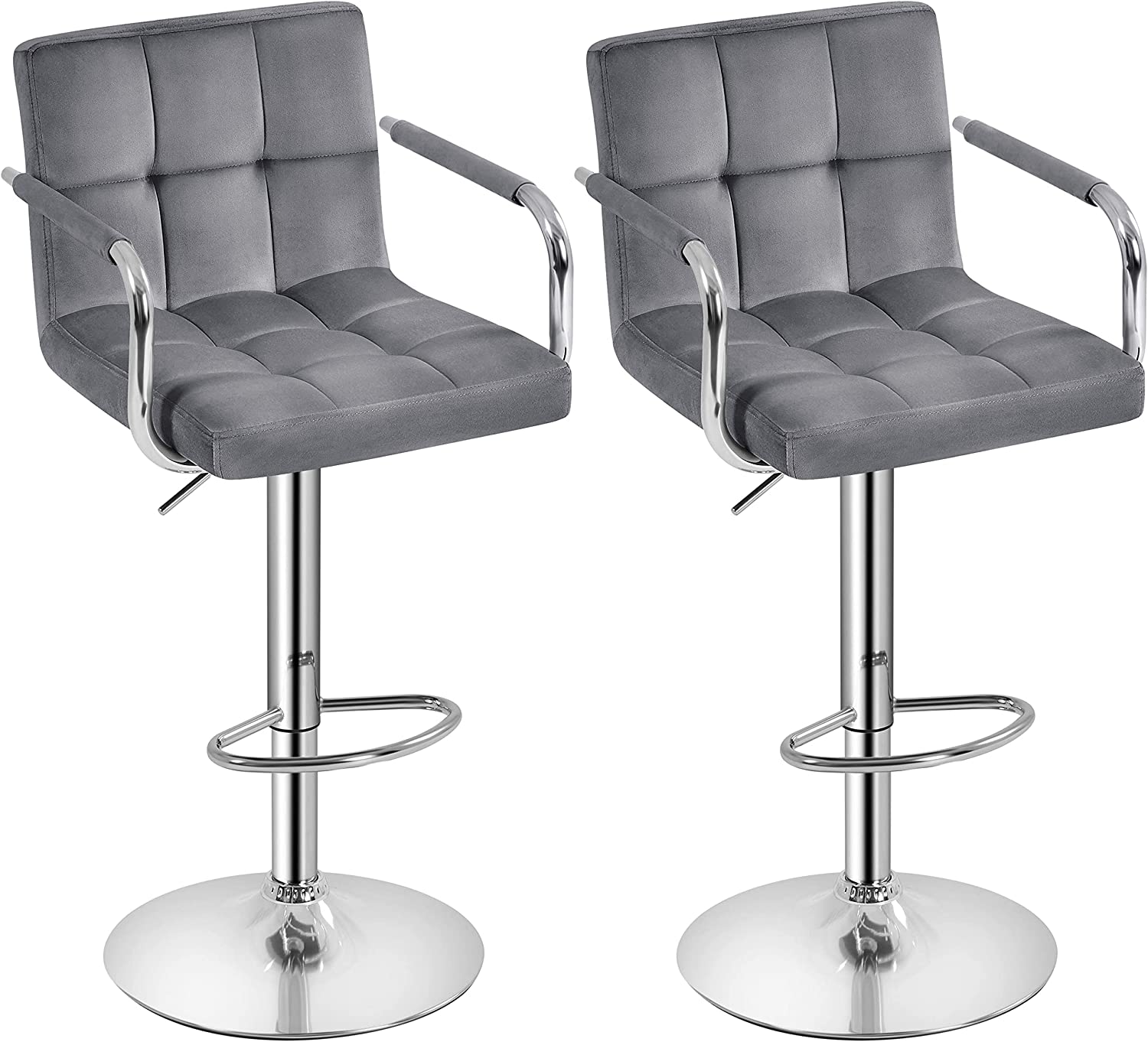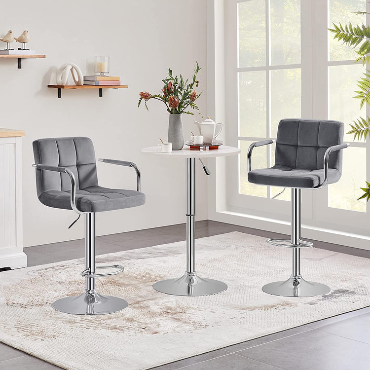 2 Set Counter Height Bar Stools Height Adjustable with Armrest, Velvet Grey/Black