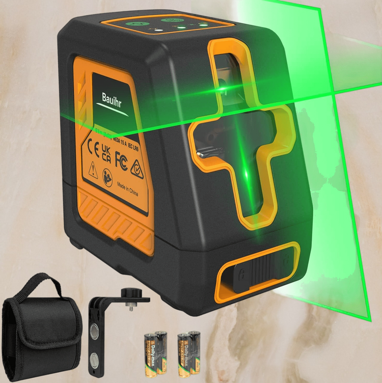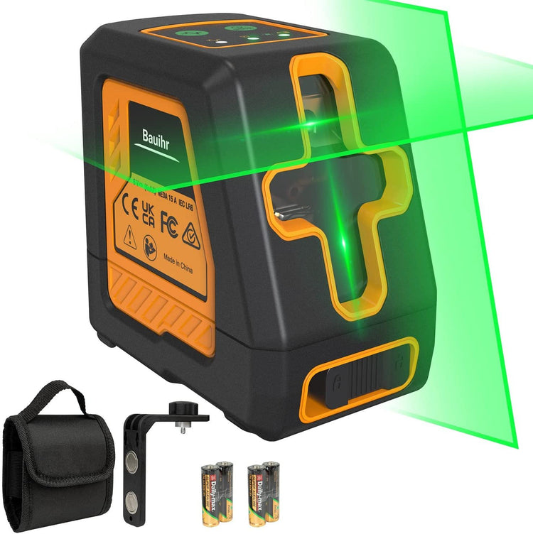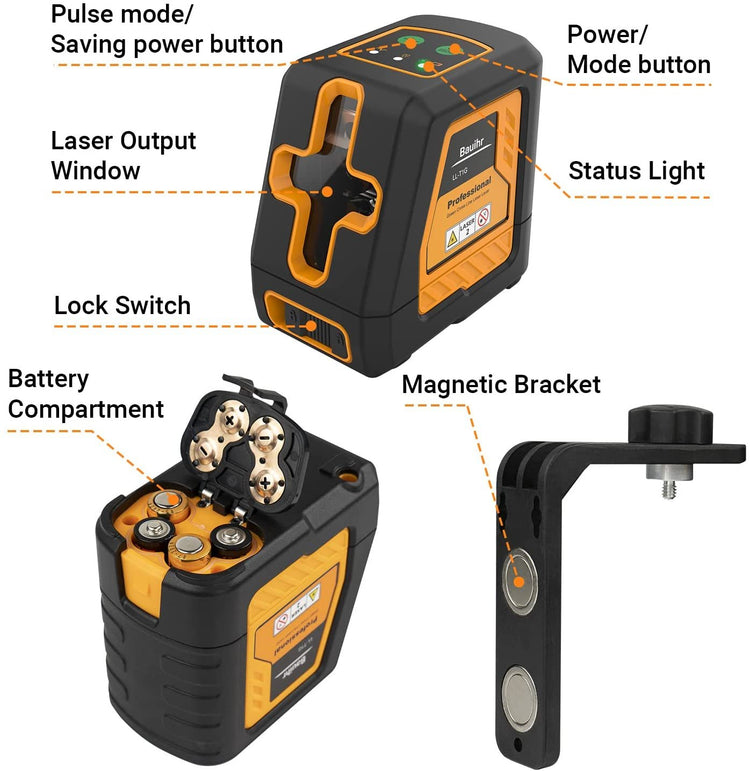 🧿【Easy to Use】- This crossline laser level provides Class II green laser with <1mW power output, applies three selective modes, horizontal, vertical and cross line, and comes with a magnetic bracket for attachment to metal surfaces and turn it around
