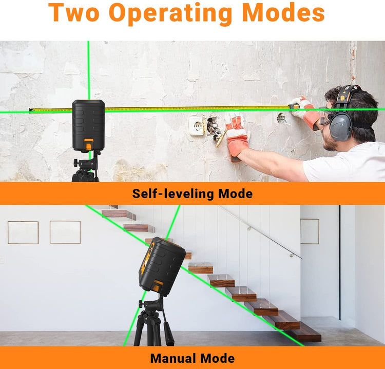 🧿【Self-leveling & Manual Mode】- The self-leveling mode allows it to be used within 4° of horizontal or vertical, otherwise the laser will flash as a warning. In the manual mode, lock lines to fixed angles for alignment needs