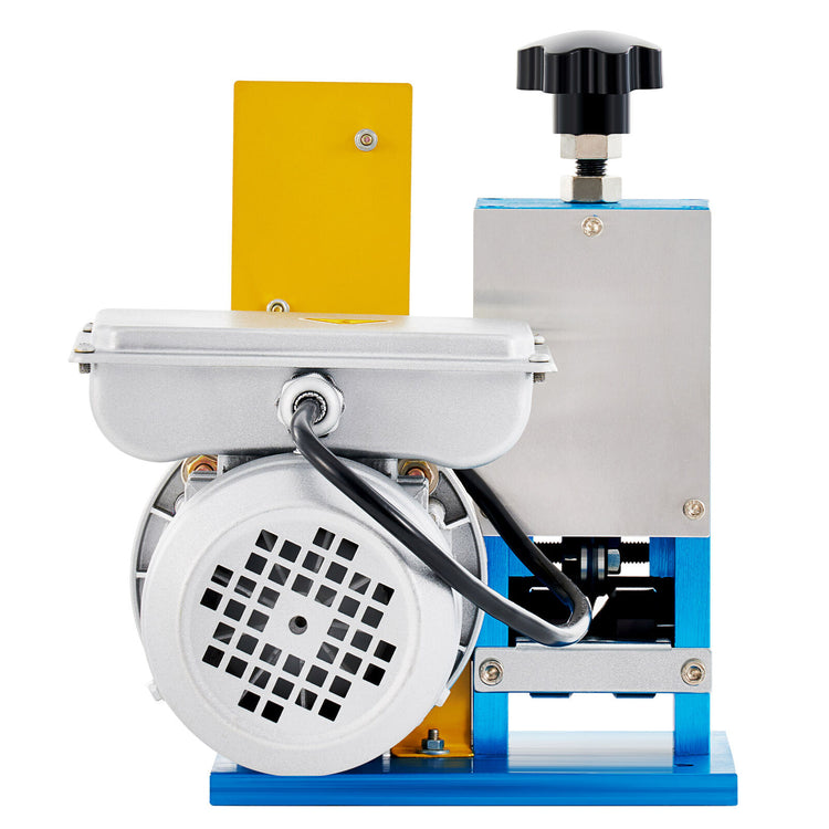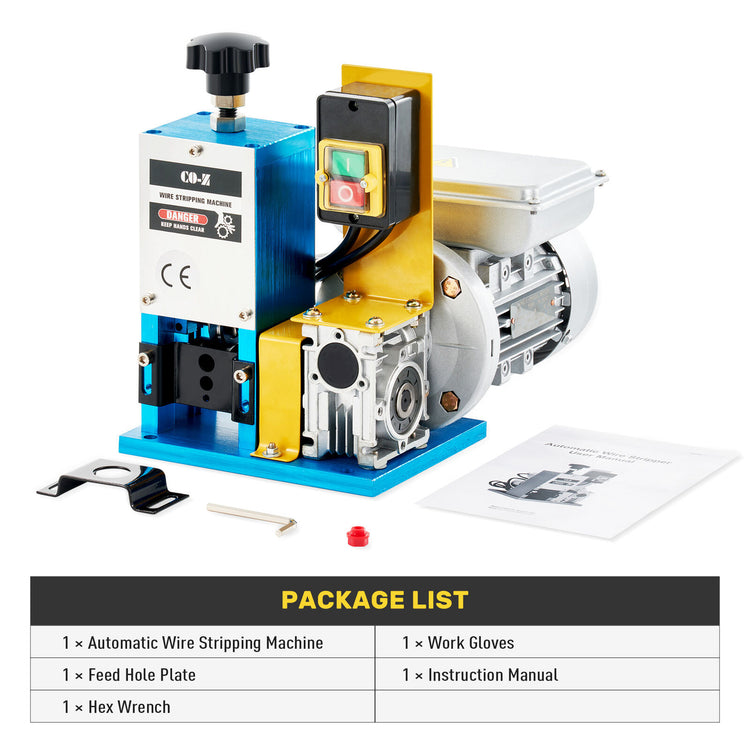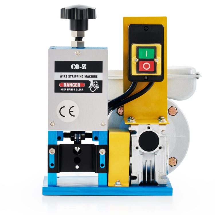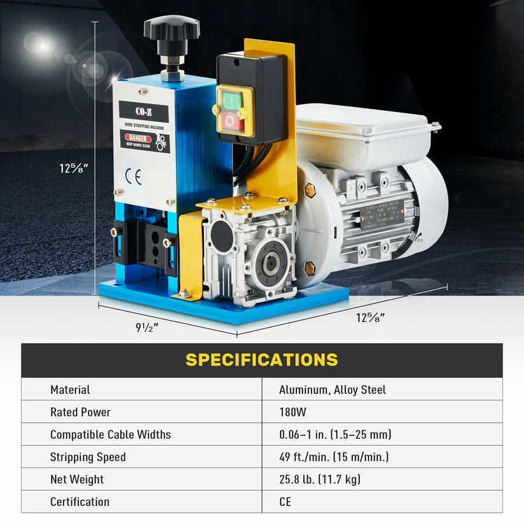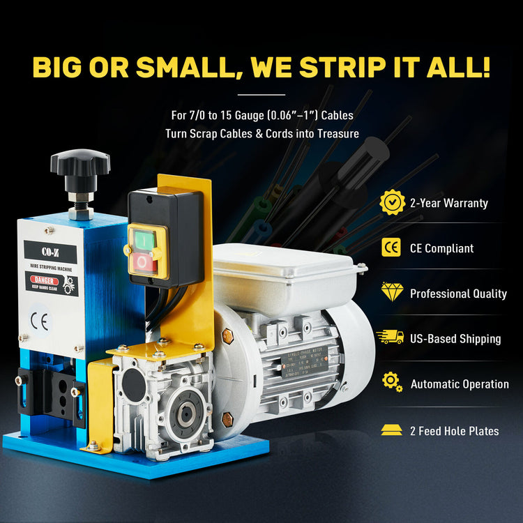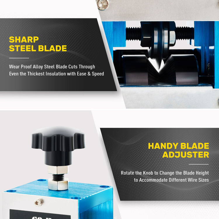 SIMPLE OPERATION: Quickly and easily set the blade height to your exact needs using the adjustment knob, hit the power button, and start feeding your copper cable through the appropriate hole; the emergency stop is standing by if anything goes awry