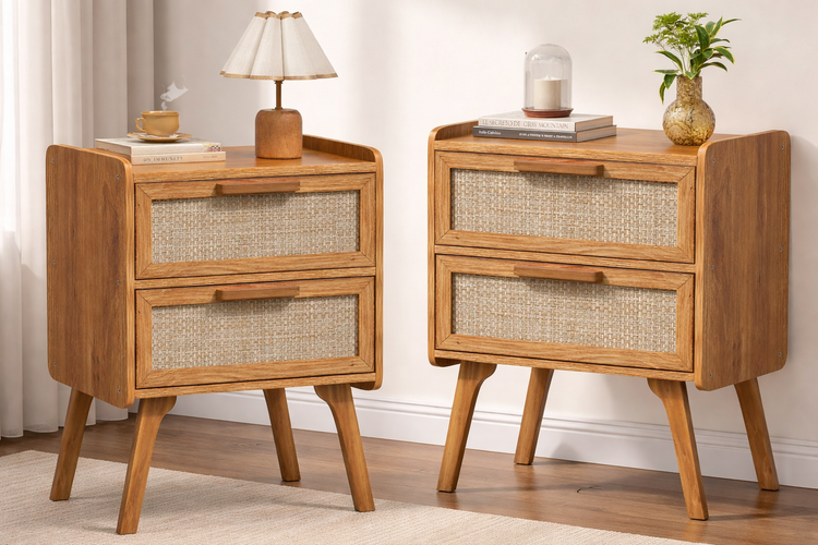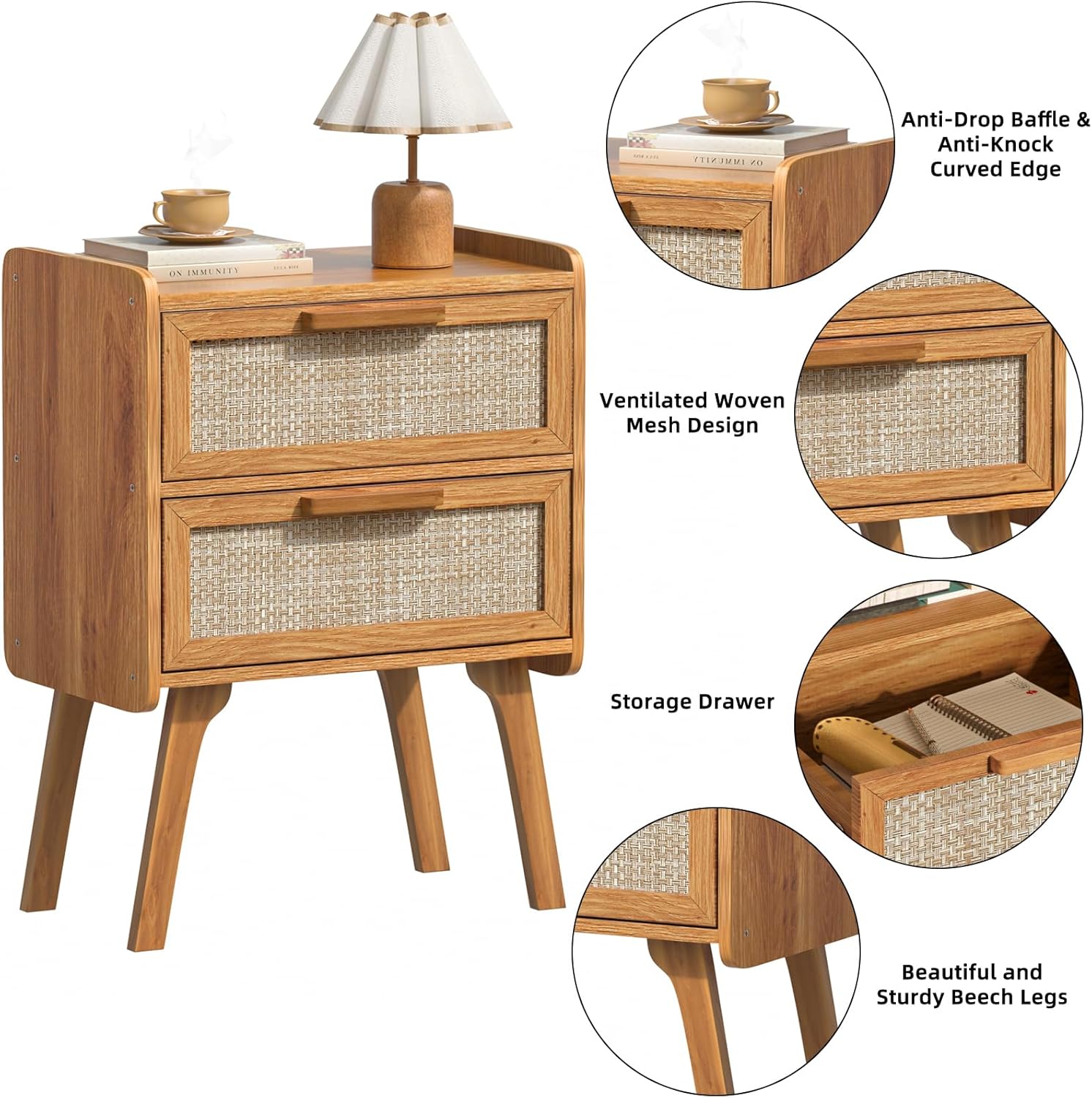 Boho Charm & Elegant Design: Rattan-accented drawers with chic beech wood legs add style to bedrooms, living rooms, or offices.